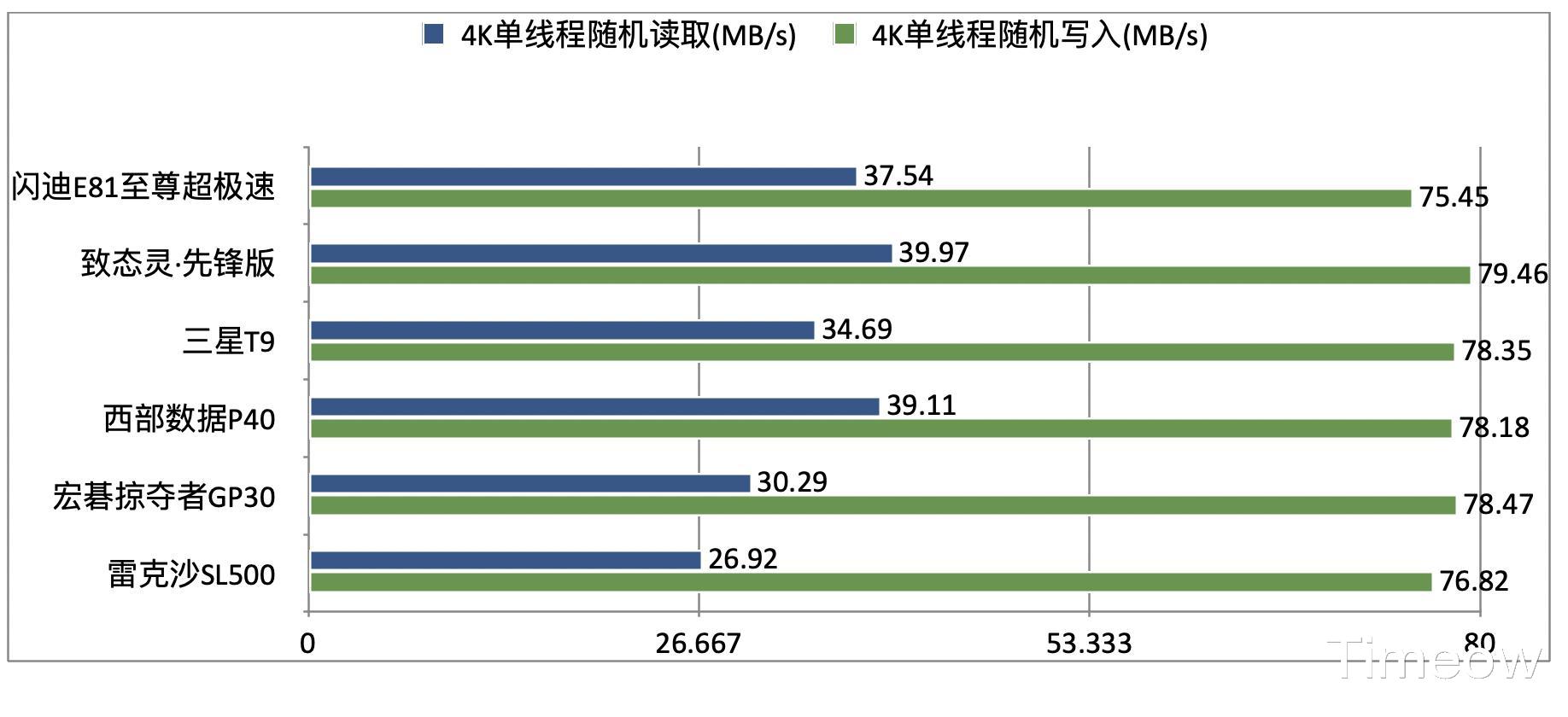 而在4K单线程随机读写性能上,除了雷克沙SL500外,其他5款的4K单线程随机读取性能都超过了30MB/s,而所有6款的4K单线程随机写入性能也都超过70MB/s、甚至接近80MB/s,属于优秀水准,在日常使用的体验上远超移动机械硬盘。