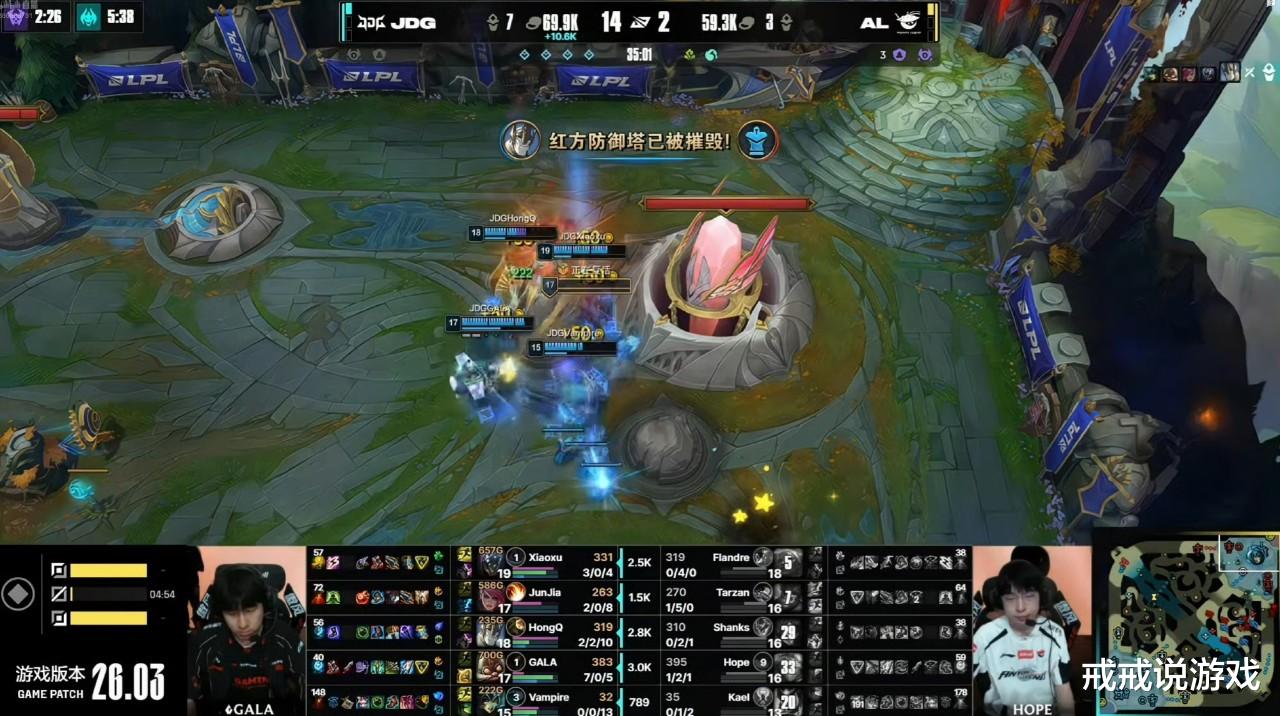 第二局AL本来也是大优,Tarzan塞拉斯前期节奏拉满,配合队友打出0换3,经济领先一度到7K,还拿了大龙。结果32分钟,Flandre的鳄鱼突然上头,1v5绕后开团,落地直接被秒。徐神阿萝拉趁机框住AL四人,JDG一波团灭对手,推平基地扳回一城。