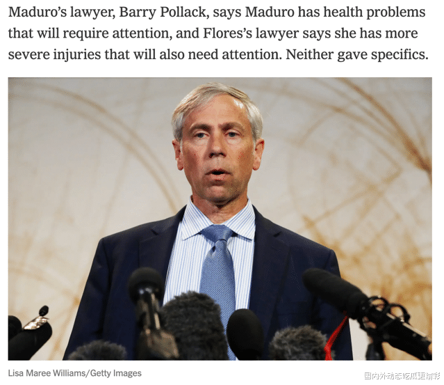 △《纽约时报》报道,马杜罗的辩护律师表示,他可能会就马杜罗作为主权国家元首的身份提出动议,并称马杜罗的健康状况需要治疗。