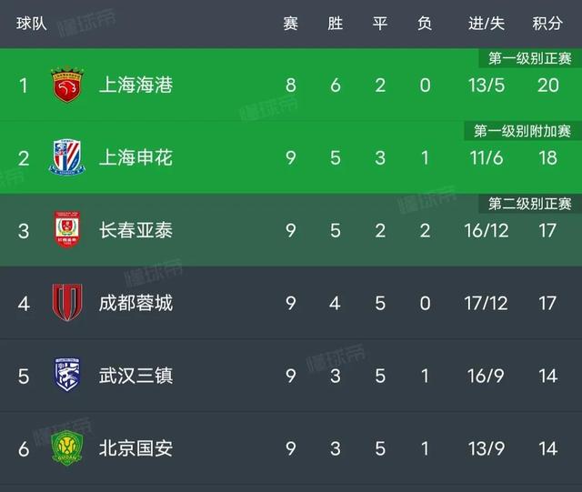 四场比赛过后,积分榜申花依旧第二,蓉城亚泰并列第三,三镇国安积14分并列第四。