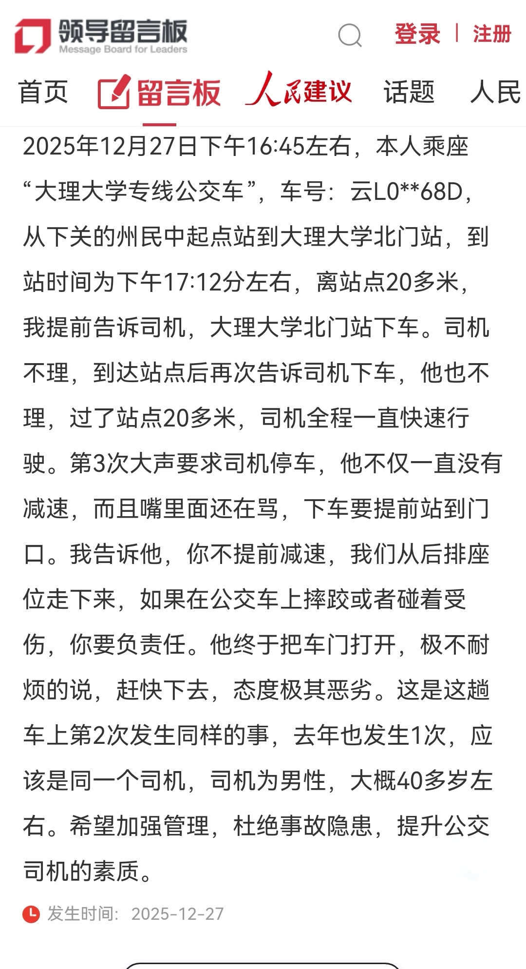加强监督管理、提升公交车司机的素质2025年12月27日下午16:45左右,本人乘坐“大理大学专线公交车”,车号:云L0**68D,从下关的州民中起点站到大理大学北门站,到站时间为下午17:12分左右,离站点20多米,我提前告诉司机,大理大学北门站下车。司机不理,到达站点后再次告诉司机下车,他也不理,过了站点20多米,司机全程一直快速行驶。第3次大声要求司机停车,他不仅一直没有减速,而且嘴里面还在骂,下车要提前站到门口。我告诉他,你不提前减速,我们从后排座位走下来,如果在公交车上摔跤或者碰着受伤,你要负责任。他终于把车门打开,极不耐烦的说,赶快下去,态度极其恶劣。这是这趟车上第2次发生同样的事,去年也发生1次,应该是同一个司机,司机为男性,大概40多岁左右。希望加强管理,杜绝事故隐患,提升公交司机的素质。