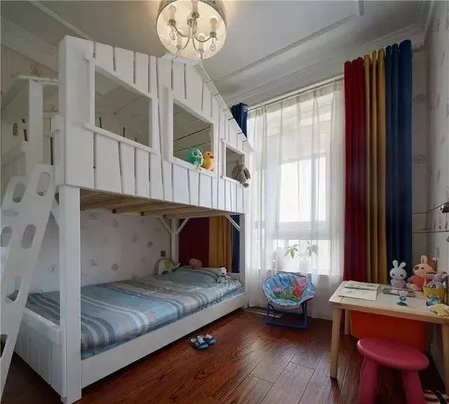 儿童房的布置,我们更是倾注了满满的爱意。上下床的设计,不仅节省空间,更充满了童趣。上铺的安全防护设计,让我们对孩子的安全更加放心。房间中还贴心地放置了小桌椅,供孩子玩耍或写作业使用。