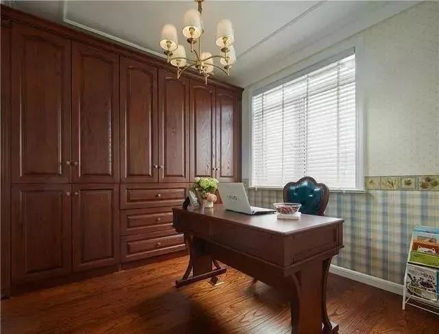 书房的设计则更显霸气与稳重。一张宽大的书桌,不仅满足了阅读和工作的需求,更彰显了一种力量感。靠墙的整面收纳柜,强大的储物空间让人赞叹不已。