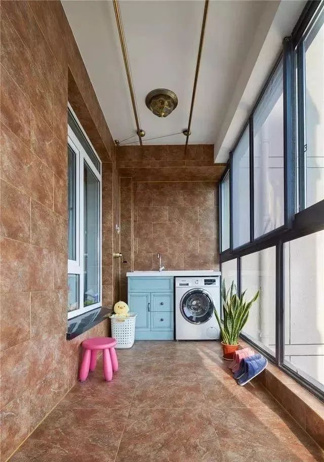 新家的阳台,无疑是我们最引以为傲的地方。宽敞的空间让人一见倾心,墙壁与地面采用统一色调的瓷砖,与室内的仿古砖相得益彰,营造出一种温馨而有韵味的氛围。一端的洗衣机一体柜和可升降晾衣架,让日常生活变得更加便捷。而待入住后,我们计划在阳台放置一套休闲桌椅,享受午后的阳光和茶香。