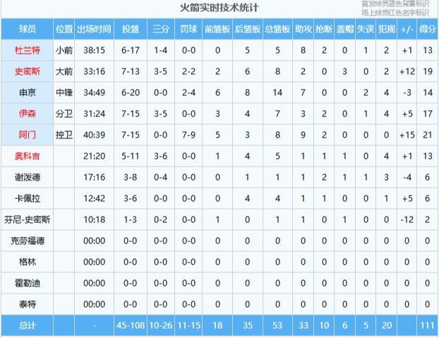 火箭:阿门21分8板9助2断、史密斯19分8板2助3帽、伊森17分7板3助2断、申京14分14板7助、杜兰特13分5板8助2断、奥科吉13分5板1助、卡佩拉6分4板1助、谢泼德6分1板1助2断
