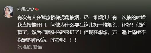 有次有人在我家楼梯拐角抽烟,扔一堆烟头!有一次抽的时候我直接推开门,问他为什么要在这儿扔一堆烟头,还好他道歉了,然后把烟头捡起来扔了!
