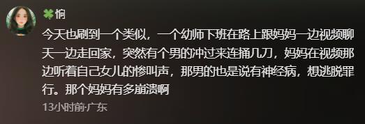 今天也刷到一个类似,一个幼师下班在路上跟妈妈视频聊天,突然有个男的冲过来连捅几刀,妈妈在视频那边听着女儿的惨叫声,那男的也是说有精神病,想逃脱罪行,那个妈妈有多崩溃啊