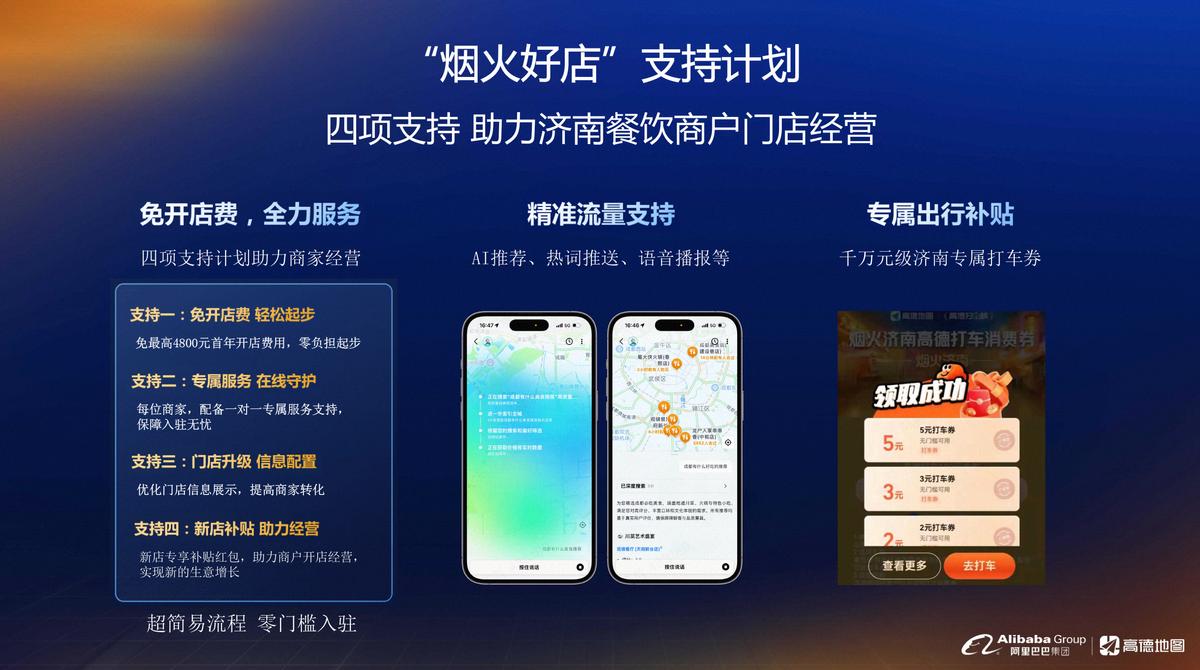 根据该计划,餐饮商家入驻高德可免最高4800元的首年开店费,并同步获得流量补贴、专属客服、智能收银等一系列支持服务。此外,针对商家不同成长阶段,高德还提供分层成长助力体系:新店期依托流量扶持+专项补贴,助力商户高效启动;成长期通过定向补贴、节日大促与精准流量支持,加速客流转化;成熟期则聚焦区域爆款和品牌IP打造,助力优质商家走向更广阔市场。