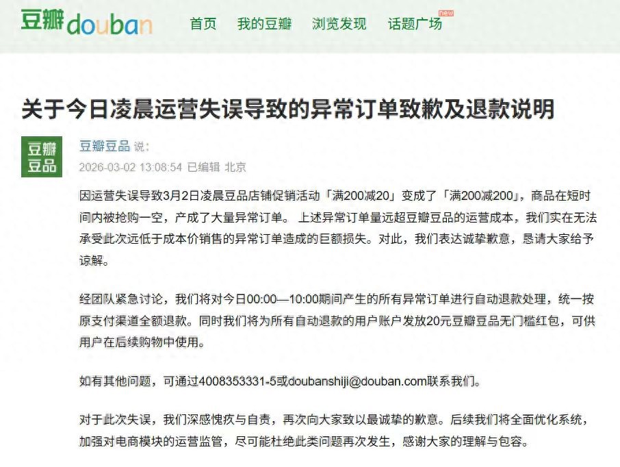 今日午间,豆瓣豆品官方发布《关于今日凌晨运营失误导致的异常订单致歉及退款说明》,表示无法承受巨额损失,将全额退款并补偿 20 元红包。