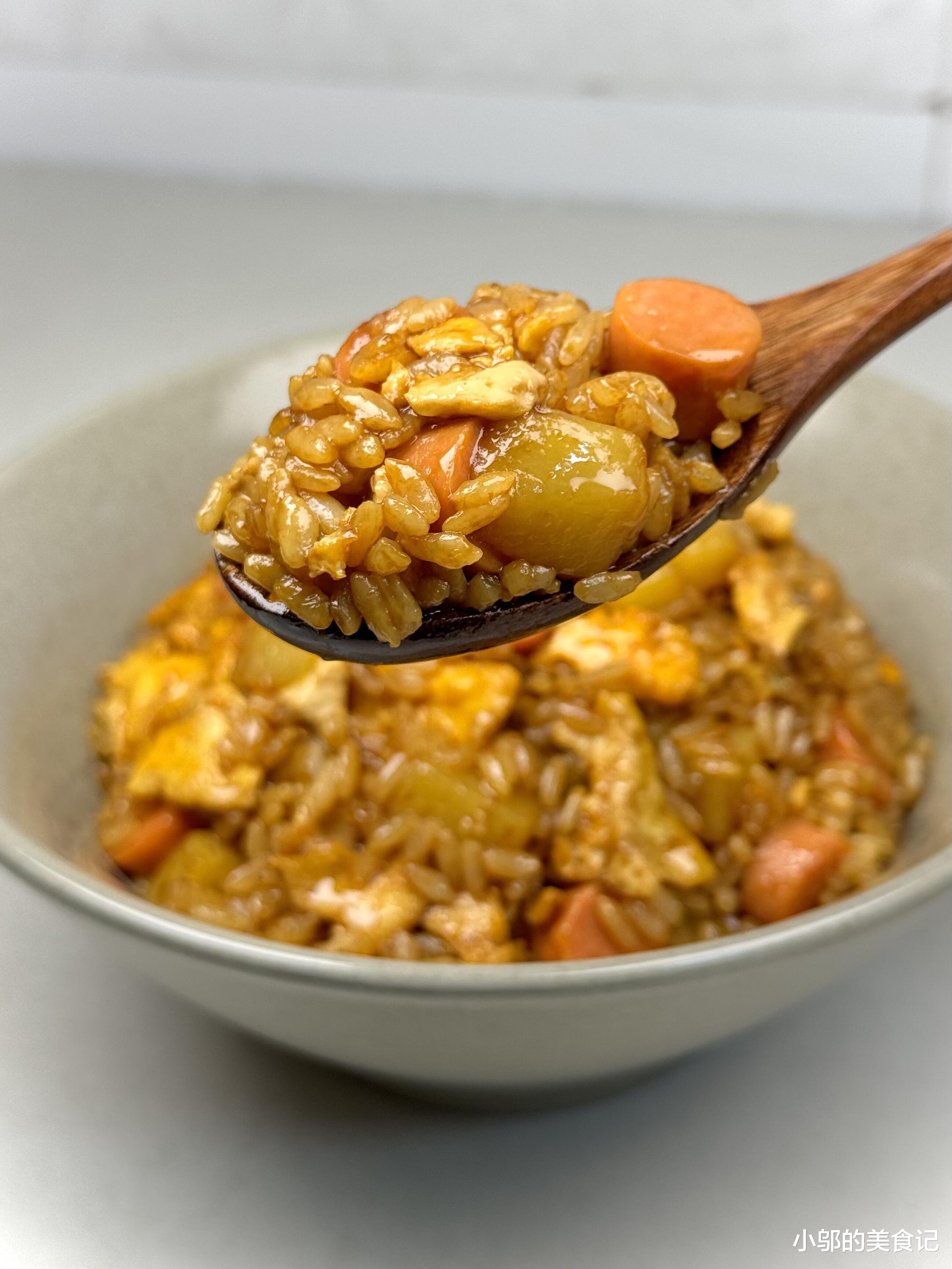 盛饭的时候,我喜欢用深口碗,把烩饭堆得高高的,酱汁顺着碗壁流下来,看着就让人食欲大开。第一口一定要铲到底,确保米饭、土豆、鸡蛋和火腿肠都能吃到。土豆煎得外焦里软,咬下去带着糖醋汁的酸甜;鸡蛋蓬松入味,火腿肠的咸香恰到好处;米饭吸饱了酱汁,粒粒分明又裹着浓郁的味道。不知不觉一碗就见了底,连碗边的酱汁都要用勺子刮干净。