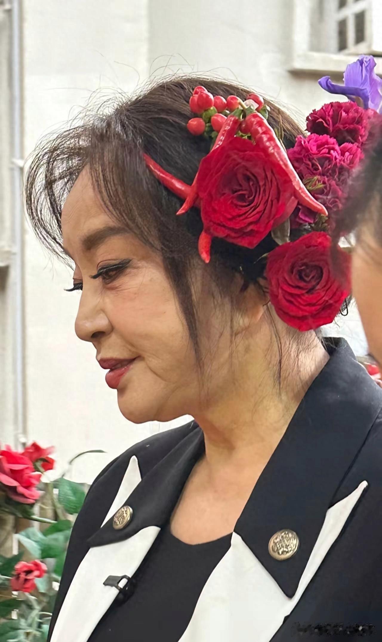 这两天刘晓庆在重庆吃火锅时被拍到头顶大红花