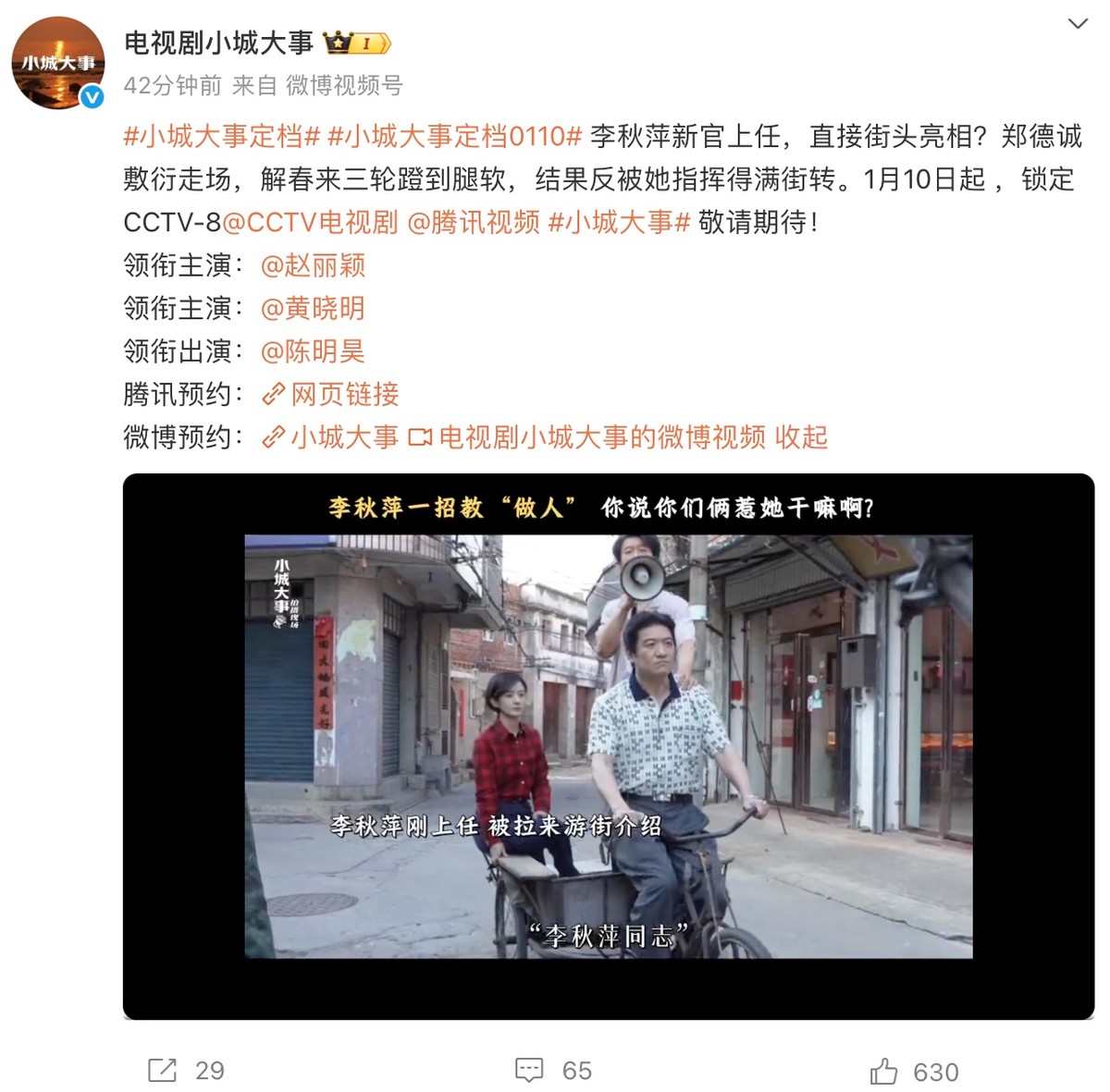 就在这样的市场偏好的加持下,2026年开年大戏的悬念终于揭晓,1月10日央视八套黄金档,由赵丽颖、黄晓明领衔主演的40集年代奋斗剧《小城大事》正式定档。