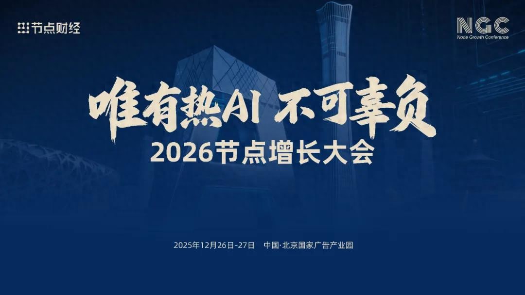 为了深度探讨这些问题,直面未来的增长和挑战,节点财经将于2025年12月26日-27日,在中国·北京国家广告产业园,以“唯有热AI,不可辜负”为核心主题,隆重举办「2026节点增长大会」