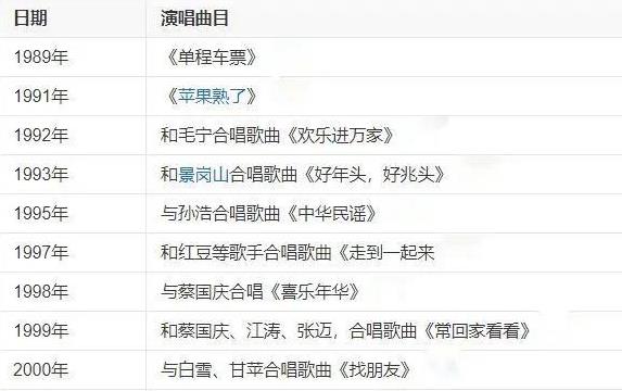 有自己独唱的《苹果熟了》,也曾和毛宁、景岗山、蔡国庆等知名歌手合作,贡献了很多春晚经典曲目。
