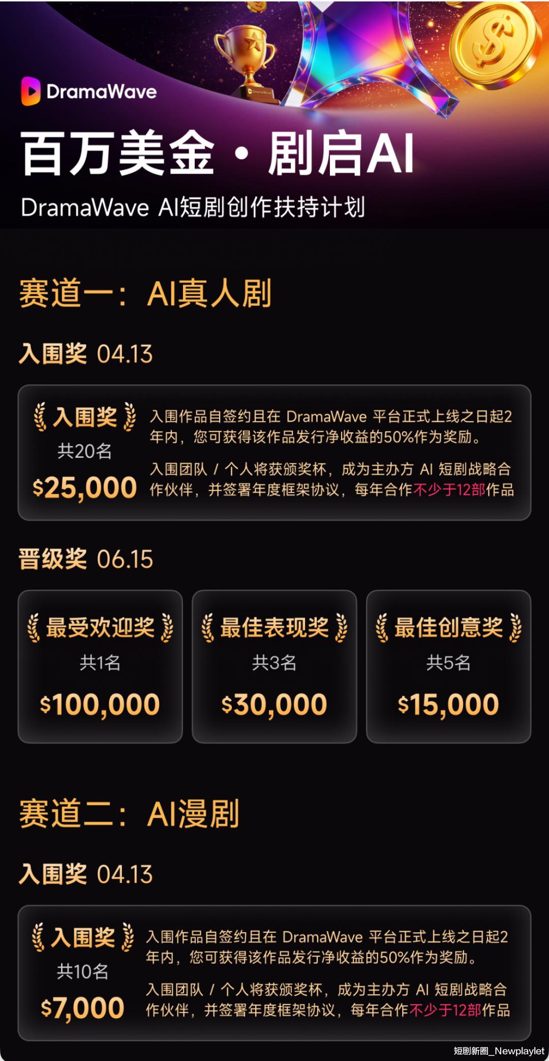 百万美金扶持,DramaWave剧启AI计划激活创作生态基于过往亮眼成绩,昆仑万维进一步升级海外短剧战略,正式推出「百万美金・剧启 AI」创作扶持计划,现面向全球个人、团队及机构创作者,征集由AI驱动、具备海外发行潜力的优质短剧作品。