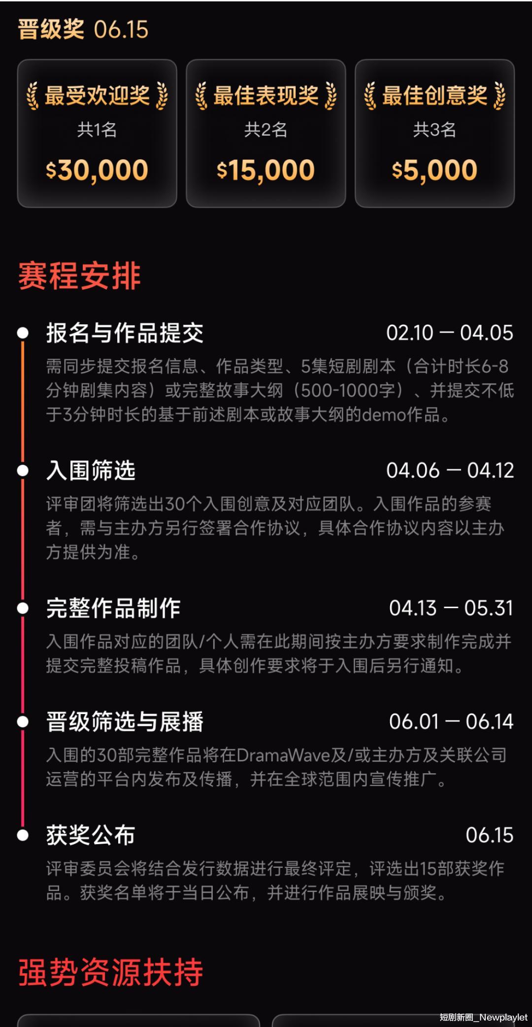 这项活动自2026年2月10日0时起至2026年6月15日24时止,整个赛程为四个月,参赛作品类型分AI真人剧和AI漫剧,题材不限。