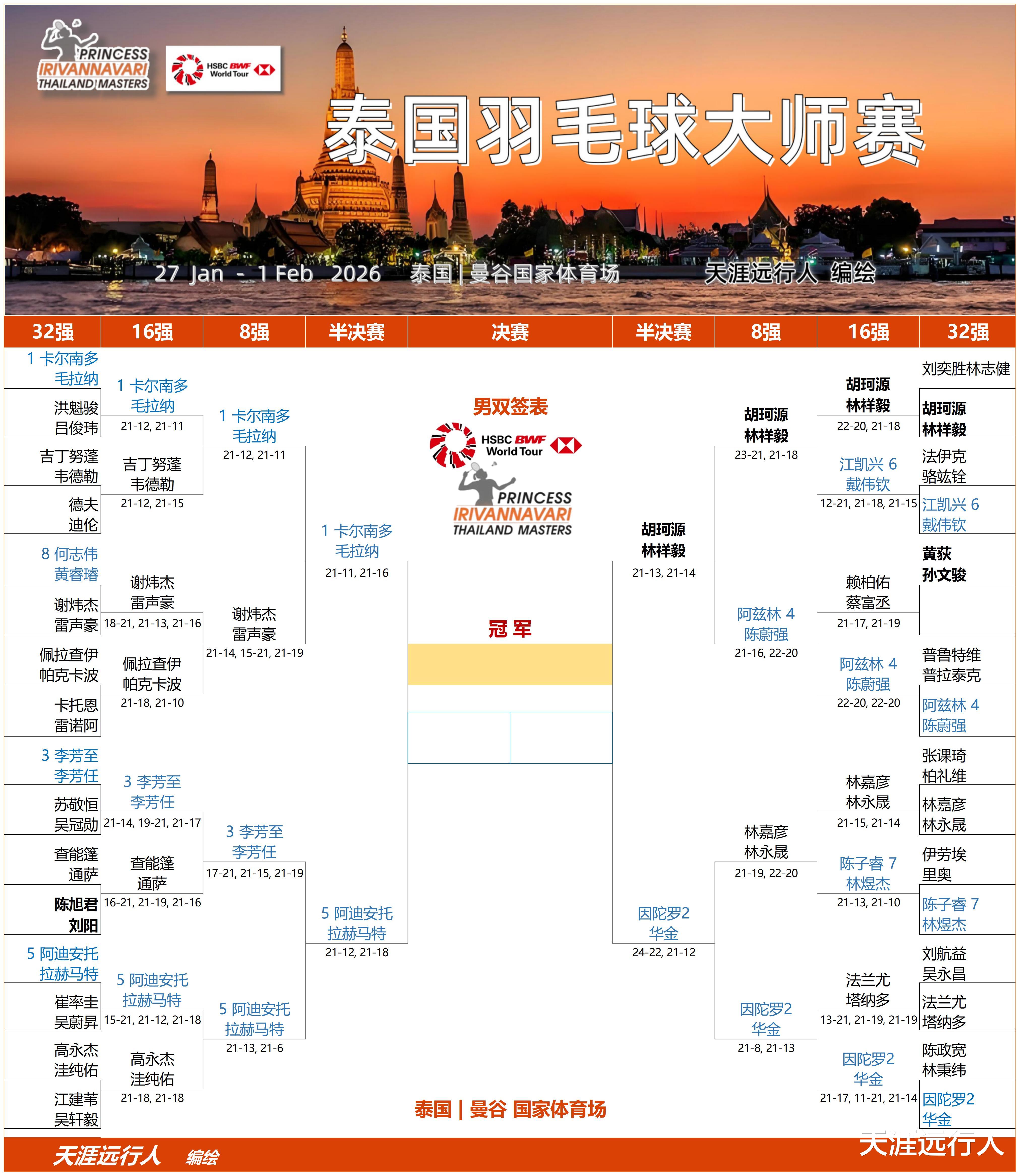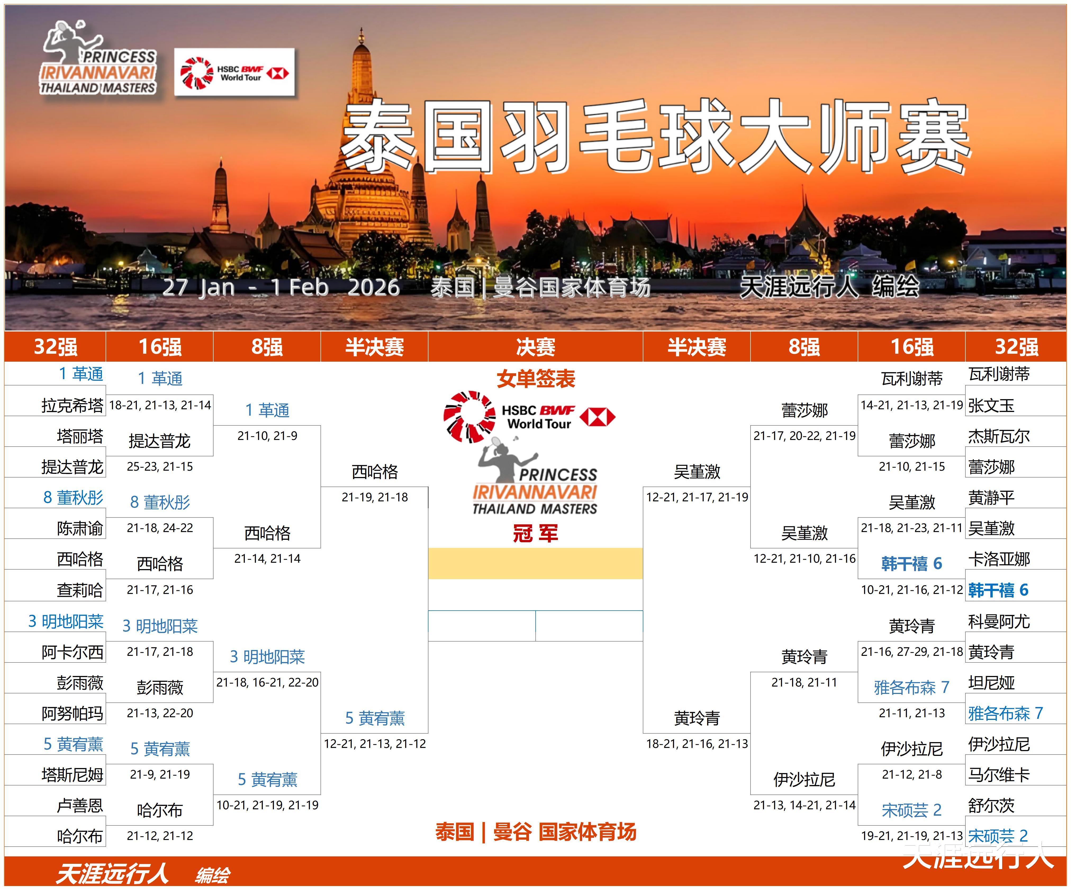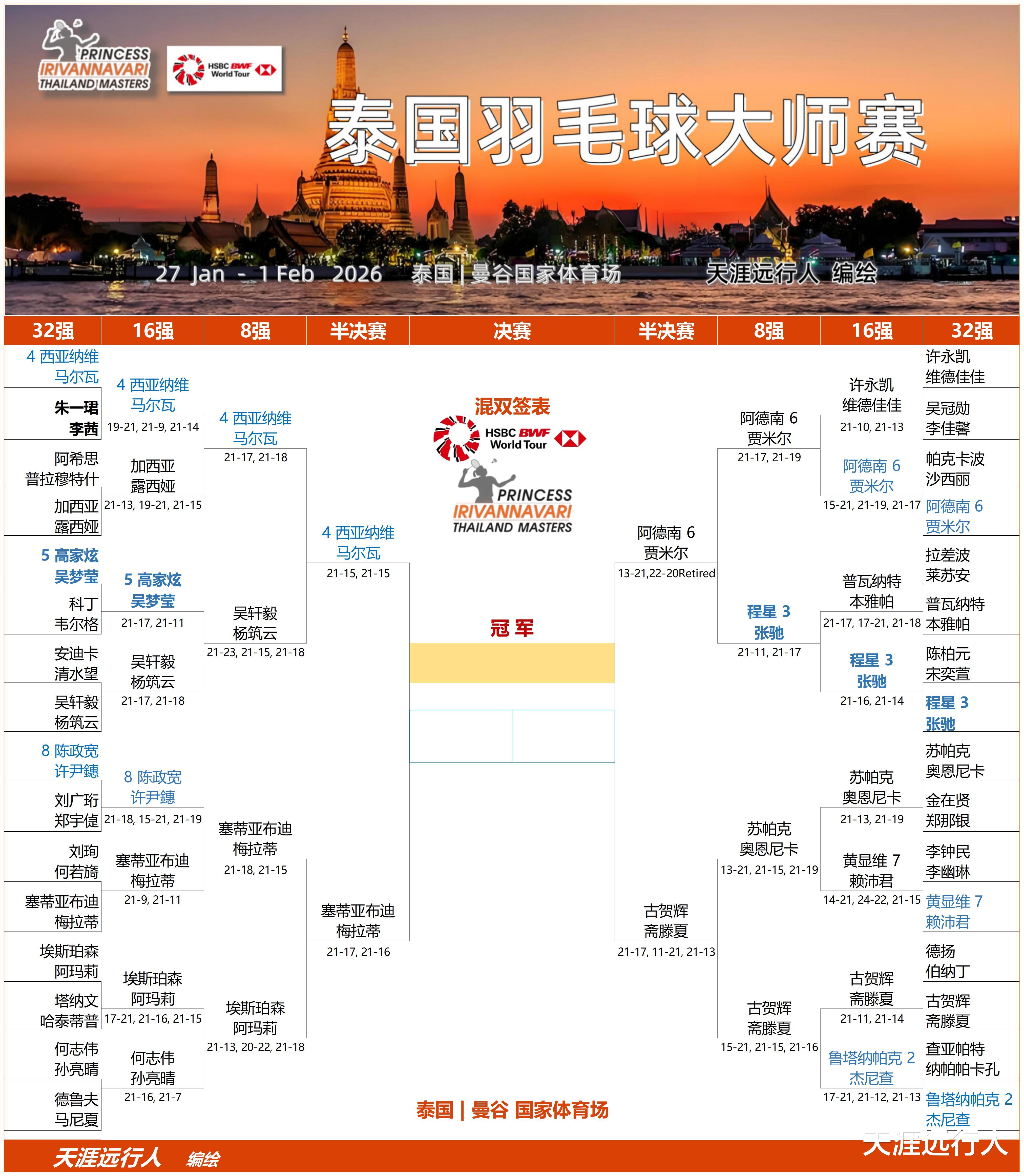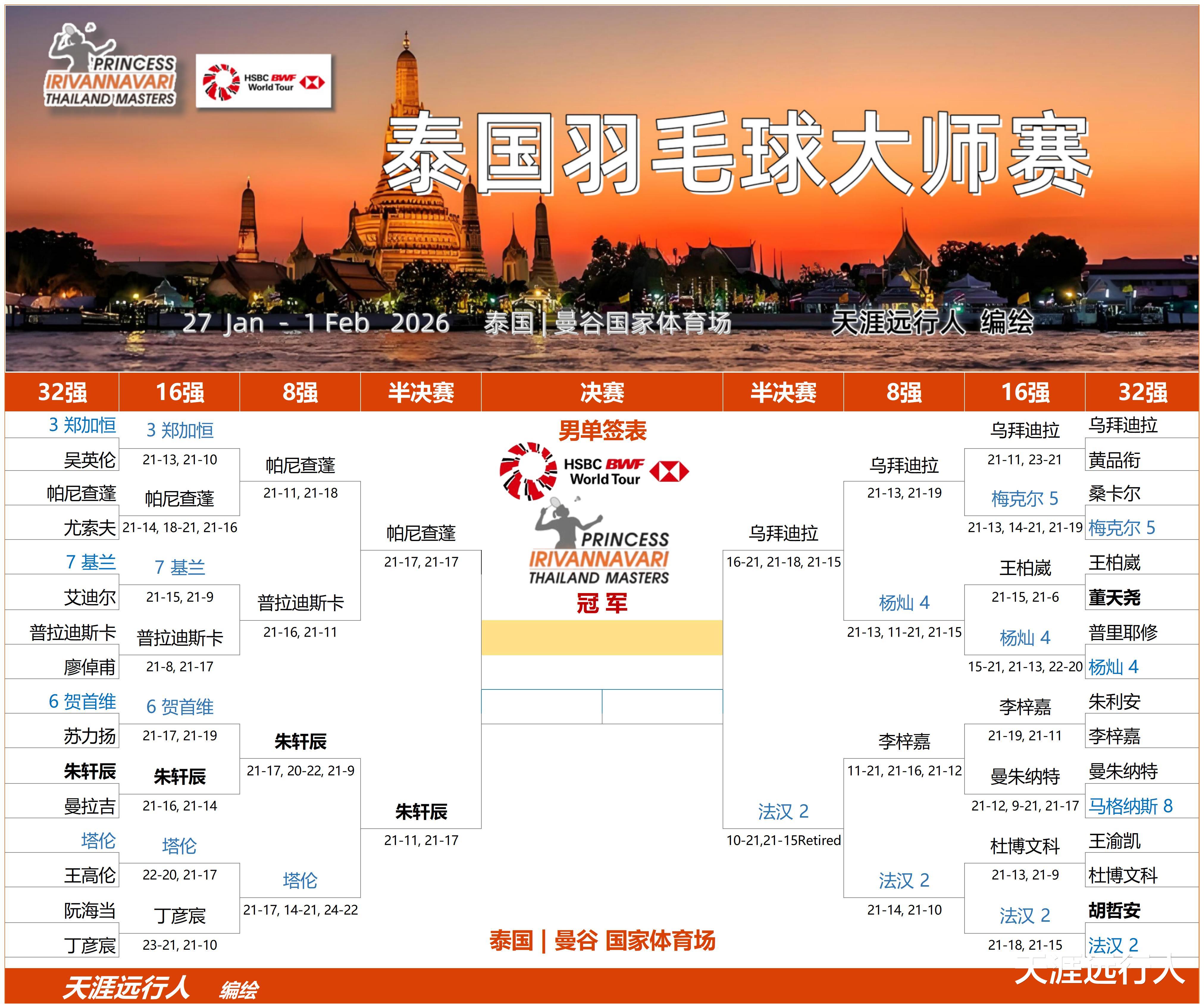 北京时间1月30日20时18分,2026世界羽联超级300泰国大师赛第四比赛日,五个单项8进4轮次的20场角逐,全部分出了高下,赛会四强悉数产生,半决赛对阵出炉。