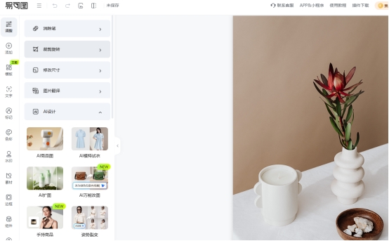 除了丰富的模板,易可图也提供了强大的在线编辑功能。它的编辑器界面直观,支持图层管理,并内置了精准的AI抠图工具,能够轻松处理复杂的图像背景,效果堪比PS中的专业操作。此外,它还集成了丰富的滤镜、字体特效和图片标记功能。