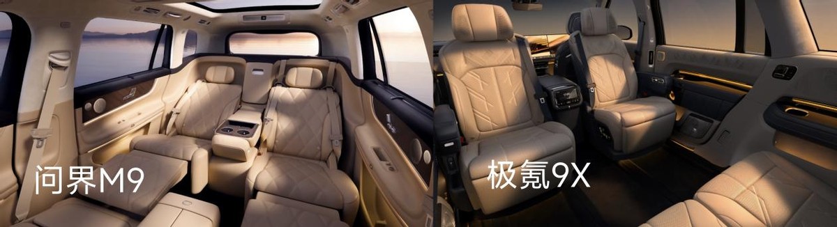 空间布局更是问界M9的一大优势。它提供尊享四座、大五座、舒适六座三种版本,满足商务接待、亲子出行、二人世界等多元需求。而极氪9X仅提供固定六座布局,第三排进出不便,满员状态下后备箱空间捉襟见肘,灵活性明显不足。