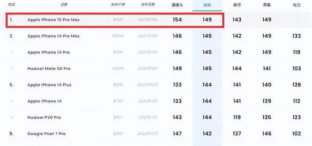 正当大家好奇iPhone15ProMax能否在影像方面超过华为的时候,知名相机测评机构DXOmark给出最新榜单,该机以总分149分登顶DXOMARK自拍榜第一,成为全球自拍之王。前五名榜单中,苹果独占四席,其中iPhone14ProMax以145分排名第二,iPhone14Pro紧随其后,Mate50Pro以145分排名第四。