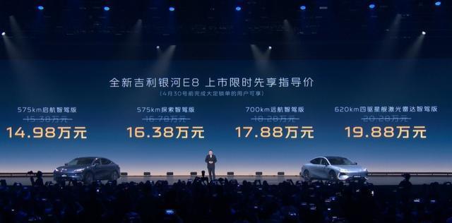 在此次发布会上,全新银河E8正式推出,同时银河星耀8 EM也首次亮相。银河E8提供了四款不同配置的车型,价格在14.98万元至19.88万元之间,且为限时优惠。