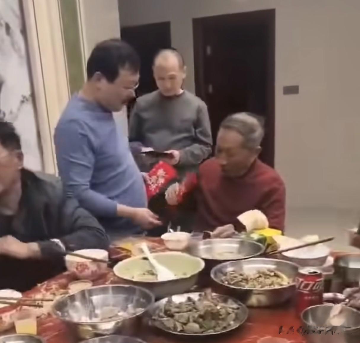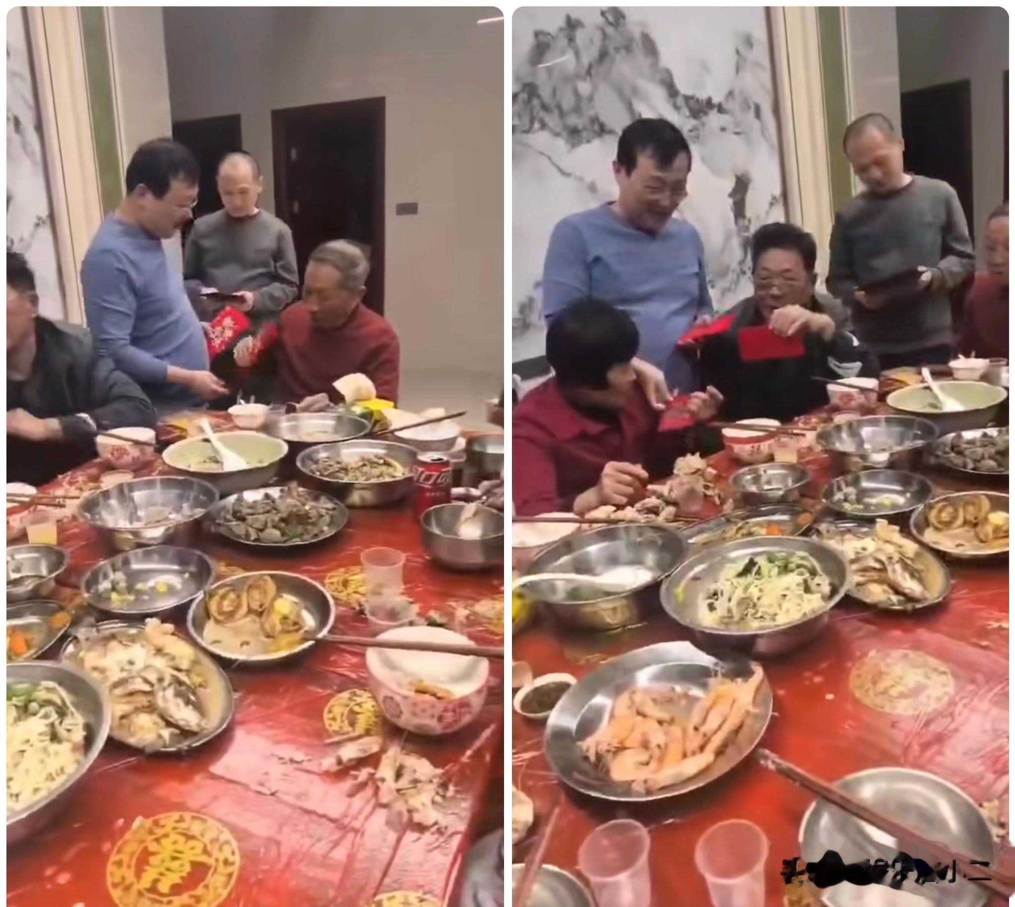 视频中大家齐坐一堂,大哥拿着厚厚一沓红包依次分发,首先给了瑾汐的爷爷,之后又给的父母,当然,桌上的每个人都有份。