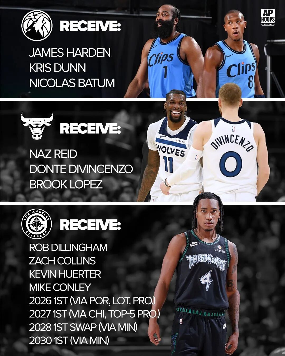 大洛佩兹、科比-布朗、2027年骑士二轮签(来自森林狼)、以及快船提供的600万美元和森林狼提供的196万美元现金。