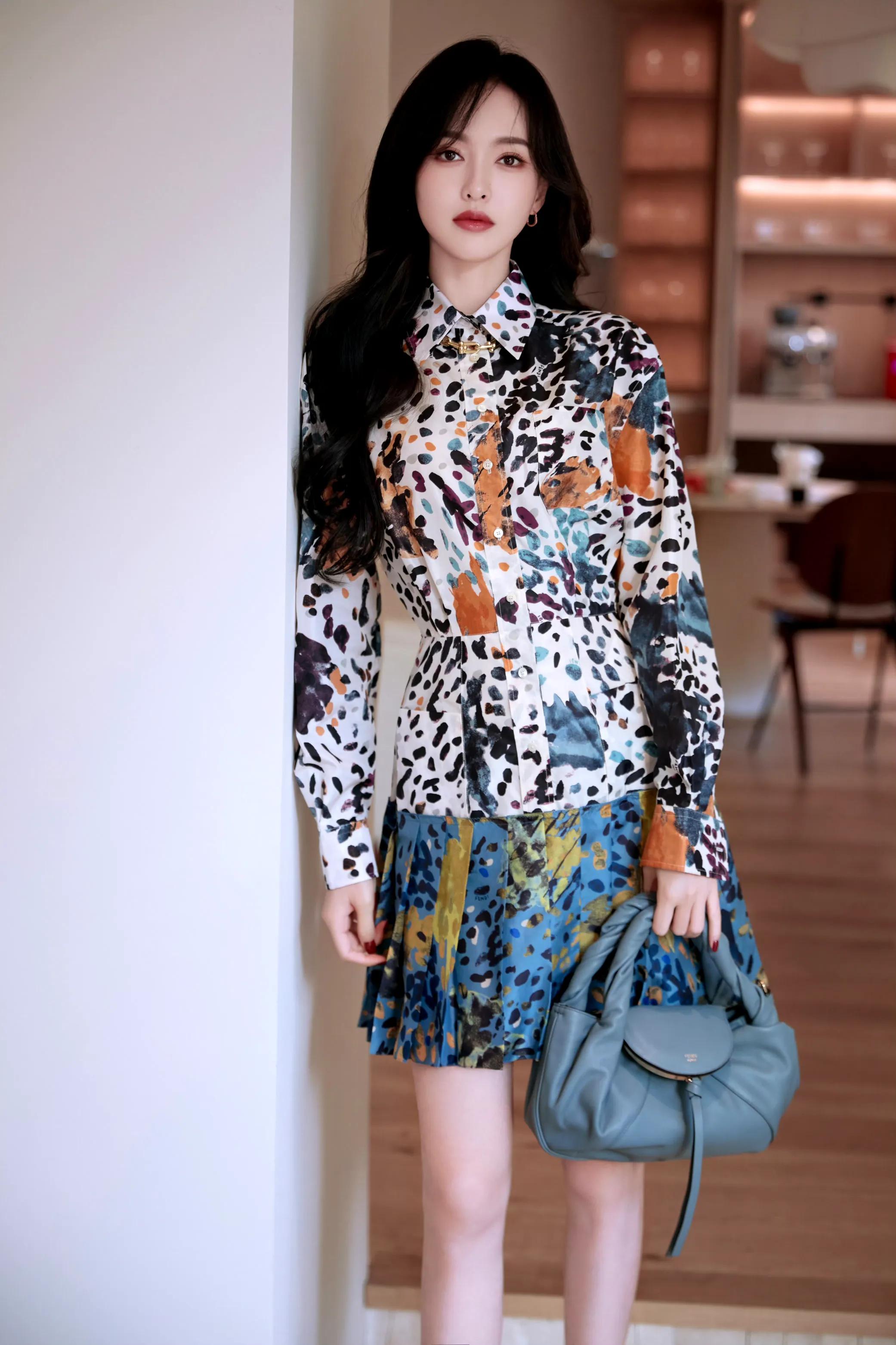 唐嫣以一身花色衬衫搭配百褶裙的室内写真亮相,完美展现出少女般的清新魅力。衬衫上繁复的花纹复古而别致,宽松的裁剪增添了几分俏皮感,与黑色百褶短裙相得益彰,轻松勾勒出纤细腰线,洋溢青春气息。镜头前的她,时而扬起甜美笑容,明亮眼眸闪闪动人;时而静立含笑,展现出御姐般的端庄优雅。柔和的灯光映照下,白皙肌肤与甜美脸庞更显温柔,仿佛一幅甜而不腻的油画。整体造型既有少女的灵动活力,又不失轻熟女性的温婉气质,令人过目难忘。
