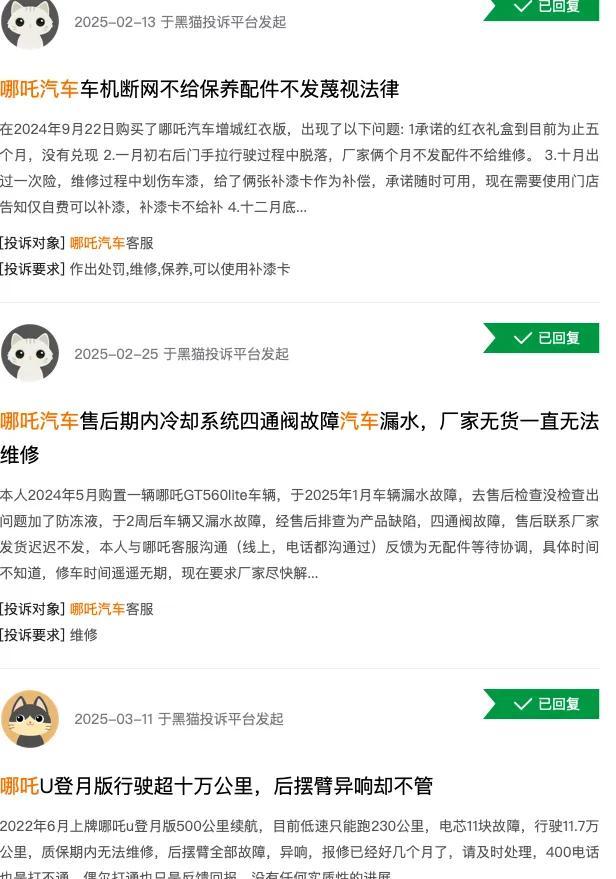 更让人痛心疾首的是,大量的车主投诉接踵而至。十七万购买的哪吒汽车,因为一些核心部件损坏,却无法得到及时维修,甚至找不到配件。纯电续航里程严重缩水,实际行驶里程远低于官方宣传,沦为“老头乐”的案例比比皆是。一些车主无奈之下,甚至只能选择第三方修理,却因此丧失了质保,面临着更大的经济损失。在黑猫投诉平台上,关于哪吒汽车的投诉已超过一千三百条,这其中,大量的投诉都指向了售后服务和配件供应的巨大问题。
