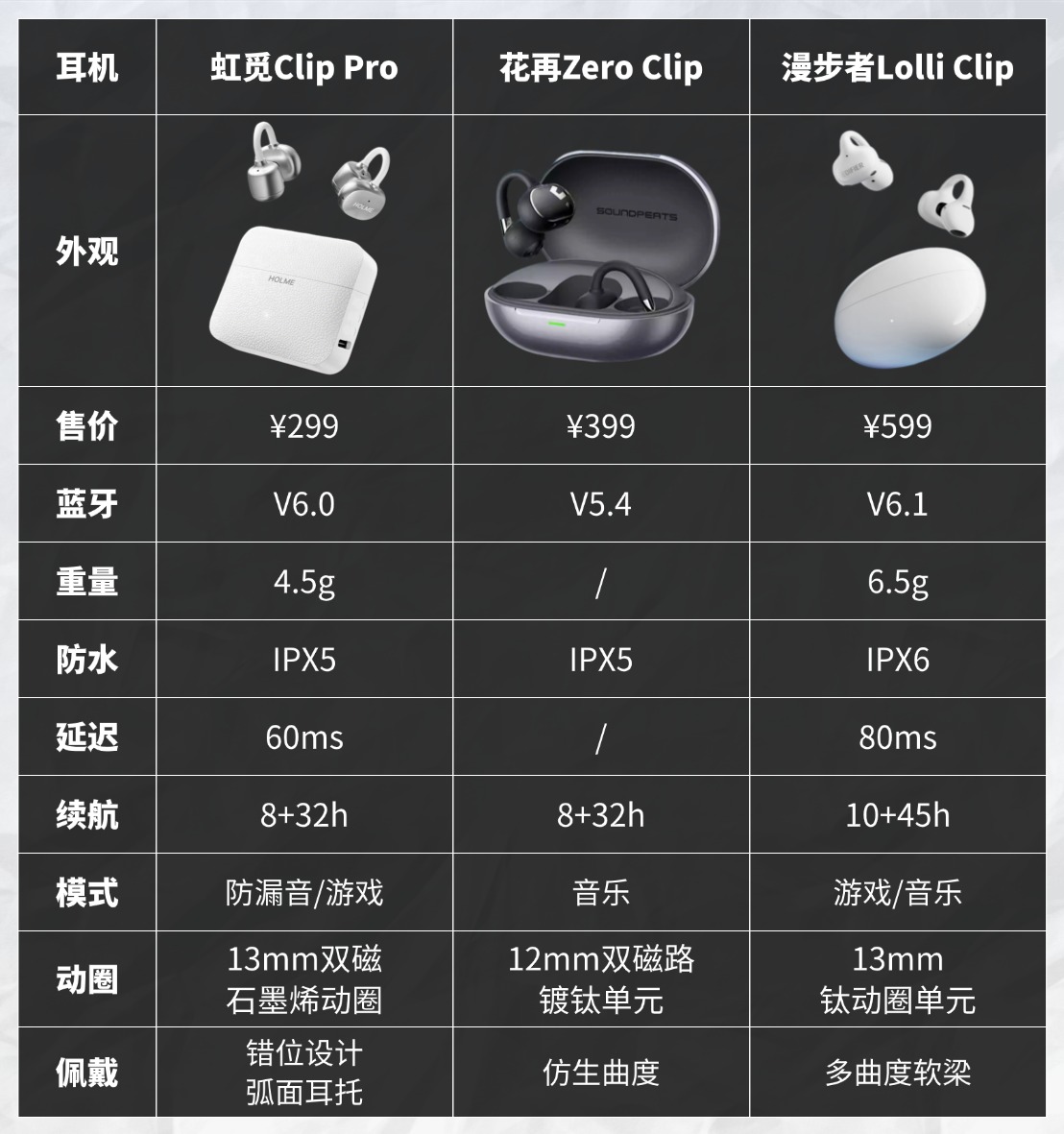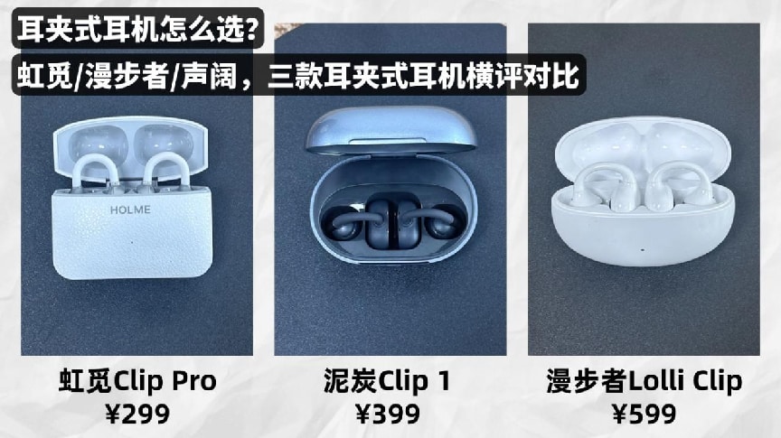 随着蓝牙耳机产品不断迭代,开放式耳机凭借“不入耳更舒适”的佩戴体验,迅速成为运动、通勤和长时间听音用户的新宠。但市场上的开放式耳机品牌众多、功能参差,究竟哪款耳机才真正好用?本文将对虹觅Clip Pro,泥炭Clip 1,漫步者Lolli Clip三款热门开放式耳机进行详细对比,从佩戴舒适度、音质表现到漏音体验,为你挑出最值得入手的那一款。