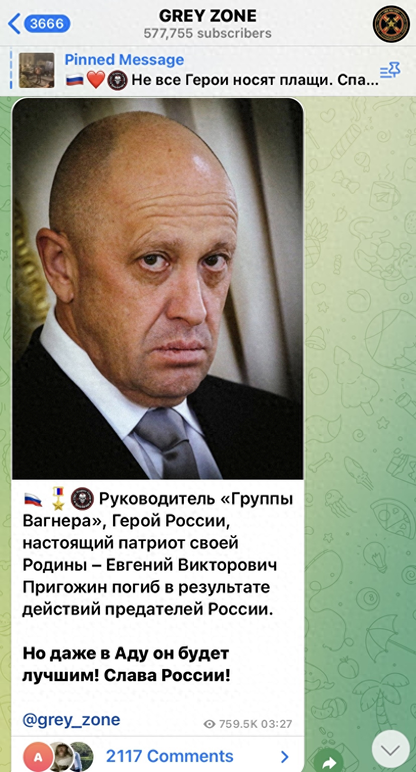 再加上普里戈任遇害的第一时间,克里姆林宫就公布了普京在结束库尔斯克之行后深夜返回莫斯科,对于普京连夜返回莫斯科,不少人也质疑,而瓦格纳电报频道“灰色地带”(grey zone)直接发文称,普里戈任“死于俄罗斯叛徒的行径。但即使在地狱,他也将是最好的!荣耀属于俄罗斯”。