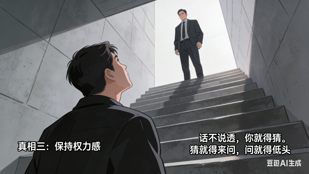 如果他把话说清楚了——“你去干A,用B方法,C时间交”——你照着干就行。那他还怎么体现“领导”的价值?他存在的意义,就是告诉你往哪走。如果你不用问就知道往哪走,他往哪站?