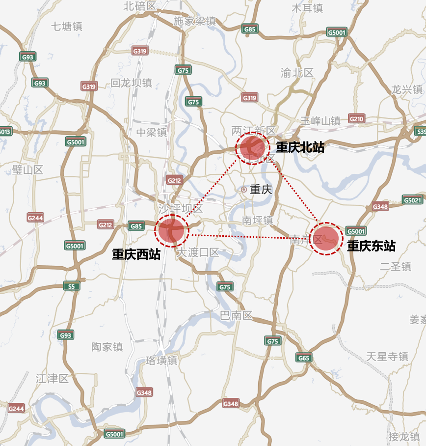 已经运行的20座高铁站中,有4座分布在主城,分别是重庆北站、重庆西站、沙坪坝站和复盛站。正在修建的是重庆东站。而这20+1座高铁站中,规模最大、能级最高、关注度最高的莫过于重庆北站、重庆西站和重庆东站。