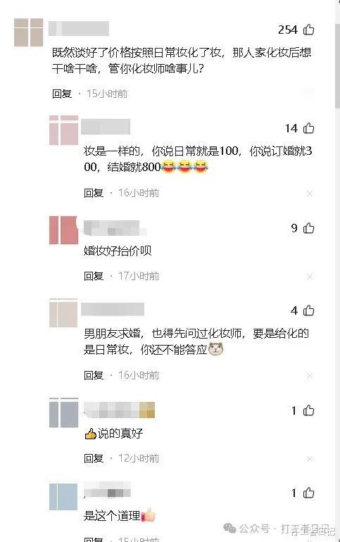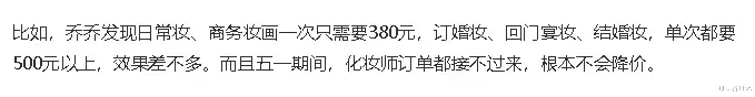 化同样的妆,去约会就300块,去订婚就要500块甚至更高。这下好了,全国人民都知道了化妆行业是这么个收费方法。