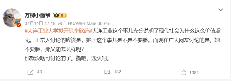 中国人对于出轨这件事,从骨子里就不允许,于是在网上对李欣莳的各种指责声音层出不穷,后续就是大连工业大学在7月8号发出公告,准备将李欣莳开除处理。