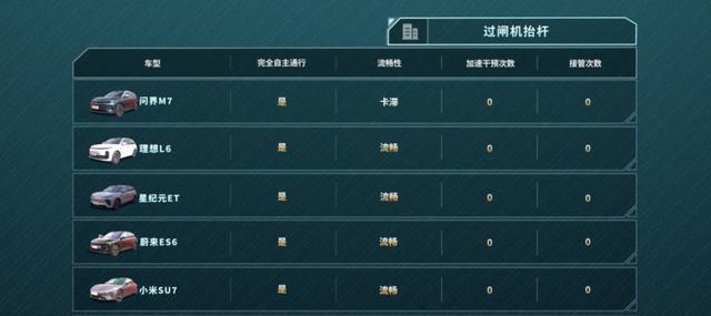 先看零速激活场景。这个场景主要就是考验车辆从车位到车道自己做决策的能力。星纪元ET和特斯拉Model Y在这个项目上表现都很不错,在停车场里都能实现零帧起手,而且路线选得特别果断,最高车速都能达到18km/h。但是呢,问界M7就有点差强人意了,只有距离桩桶车道比较近的时候才能激活,这差距一下子就出来了。蔚来ES6虽然也能激活,可是车速只有5km/h,而且车道选择的时候也很迟疑,这么一对比,效率上的差距就很明显了。