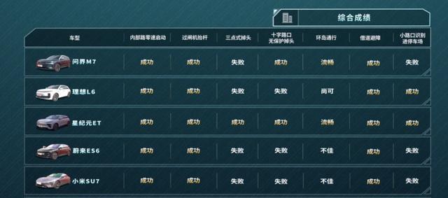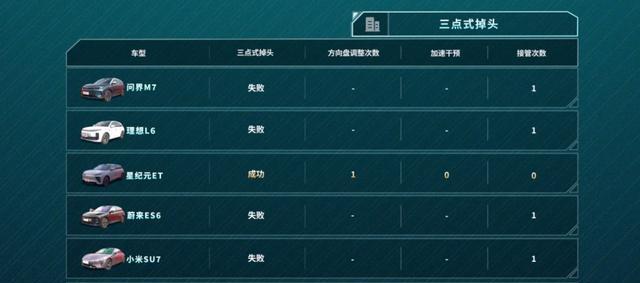 接下来就是那个被称为“地狱难度”的三点式掉头挑战场景了。这个可不容易啊,但是星纪元ET凭借着精准的路径规划和动态礼让,竟然成为了唯一一个不需要人工干预就能顺利通关的车型。其他车型呢,有的就不支持这个功能,在测试的时候只能中途卡顿,然后得靠人工接管才能继续通行。像问界M7和星纪元ET在挑战十字路口无保护掉头的时候都顺利通过了,不过问界M7是直着往前多开几米借空间,星纪元ET则是选择提前向右打方向借空间,各有各的策略。