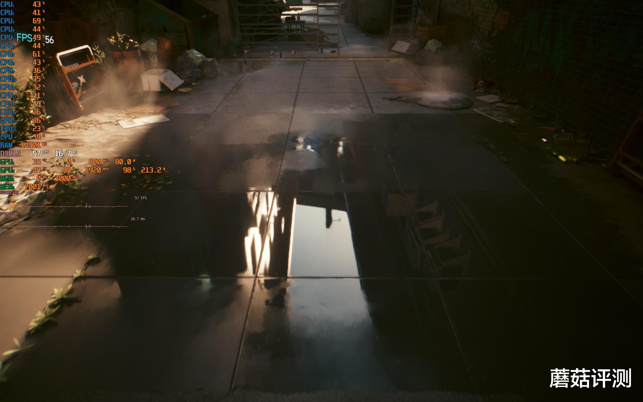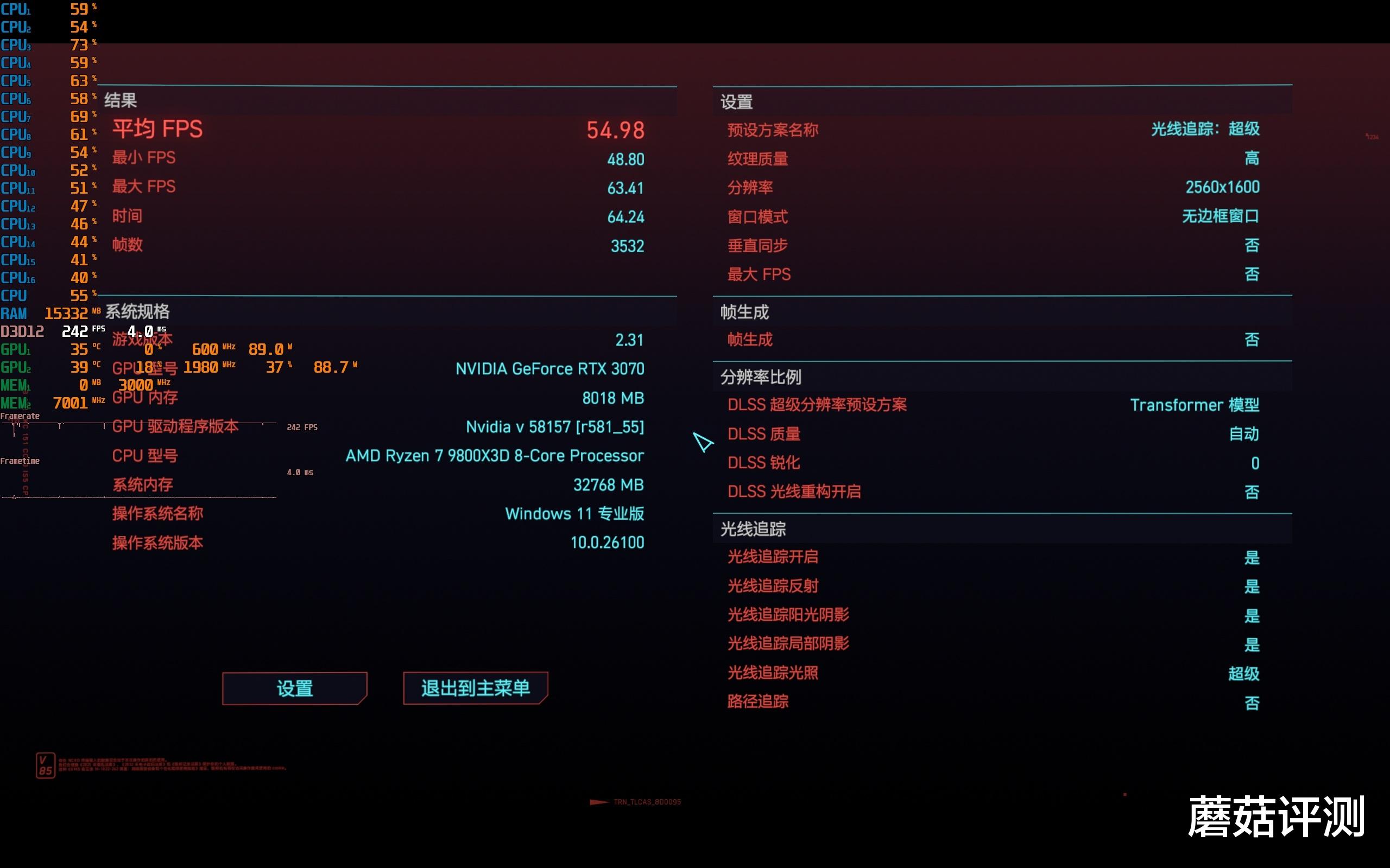 ▼最后整体的游戏帧数在54.98帧左右,很接近60帧了,表现还不错了,说实话,毕竟这是光追超级画质。