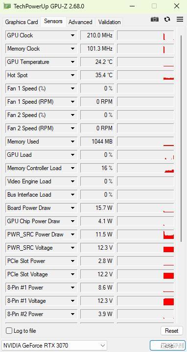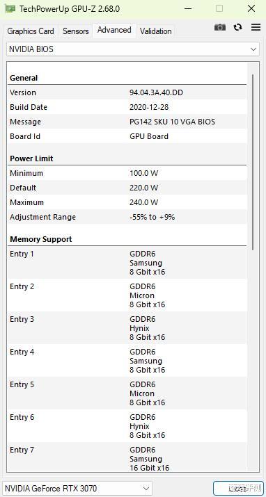 ▼显卡的默认功耗在220W左右,最大功耗在240W左右,和常规的RTX 3070显卡一样,并没有因为水冷散热模组,就给一个比较夸张的功耗,有点意外。
