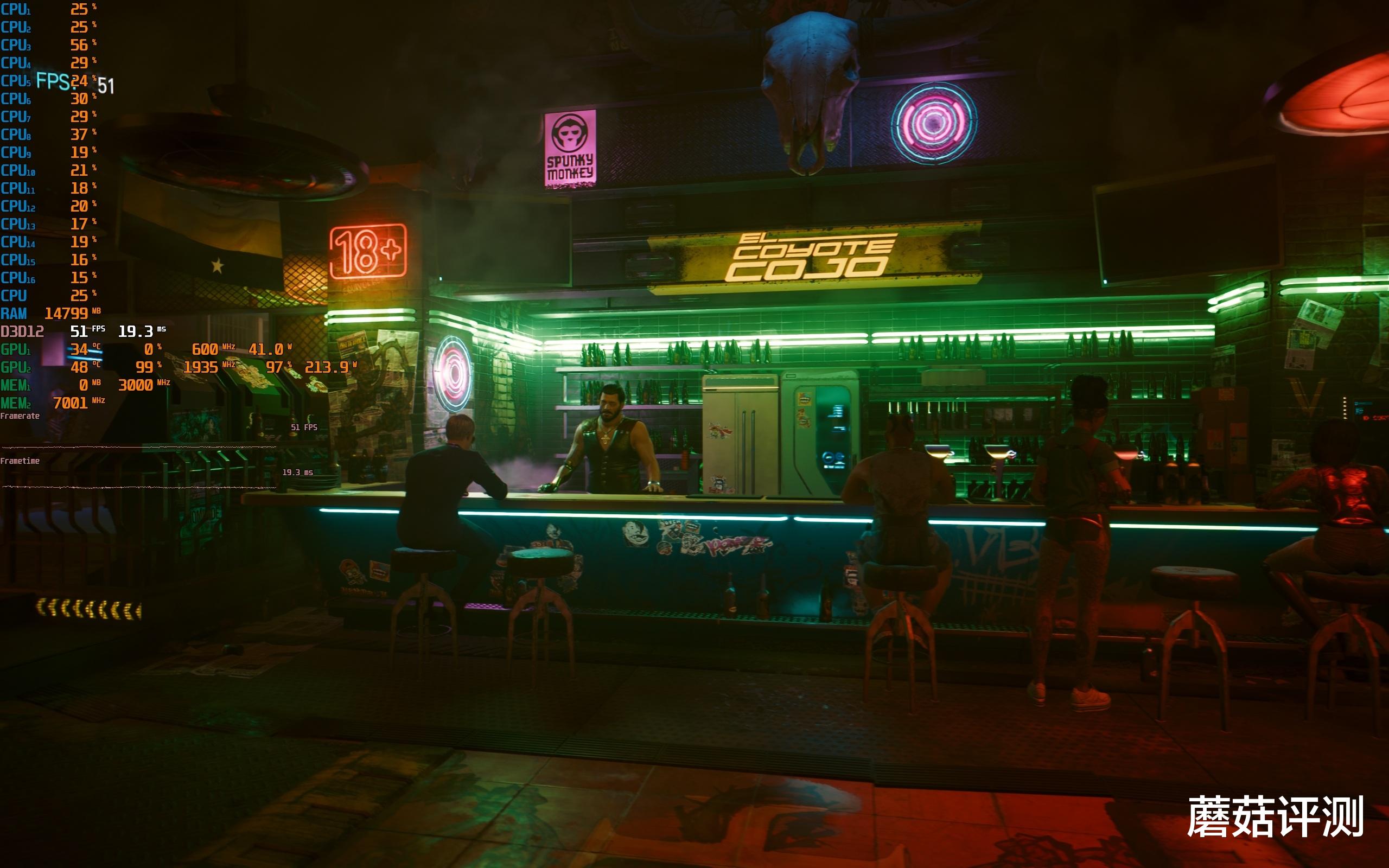 ▼酒吧吧台的游戏帧数在51帧左右,这个画质特效,对RTX 3070这张显卡来说,有点超出能力了。