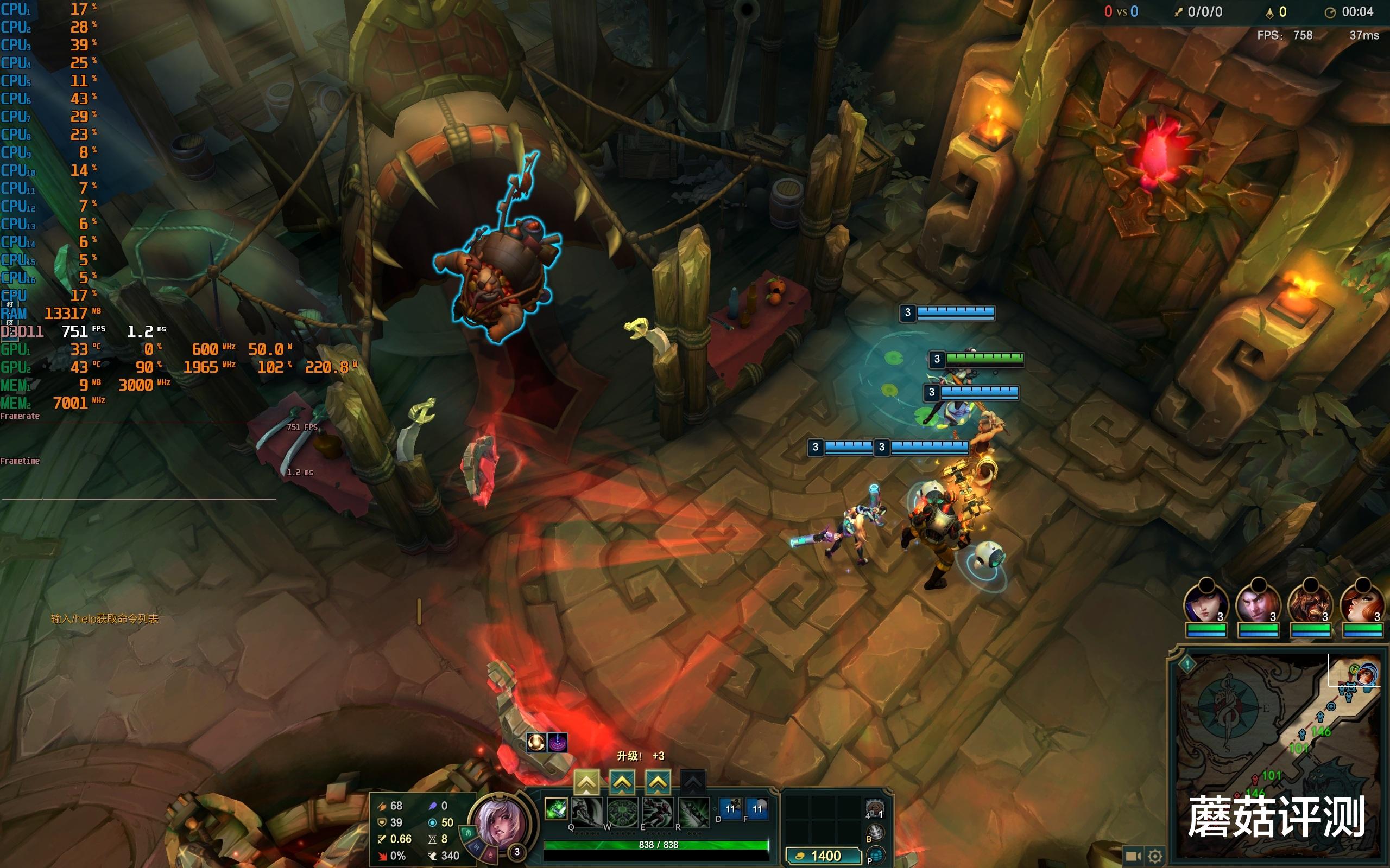 ▼LOL大乱斗模式,2K分辨率,全极高画质,泉水游戏帧数在751帧左右,非常流畅。