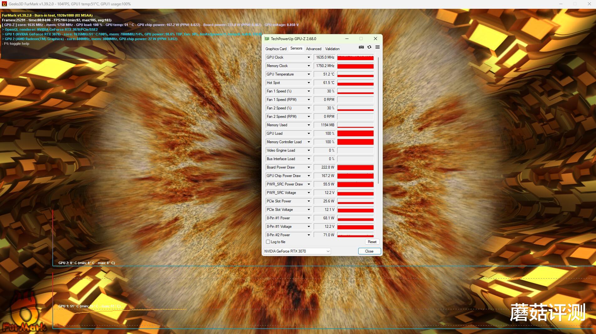 ▼最后跑个散热测试,默认50%风扇转速,跑个甜甜圈测试,显卡的核心温度在51.2℃,热点温度在61.5℃,功耗在223W左右。