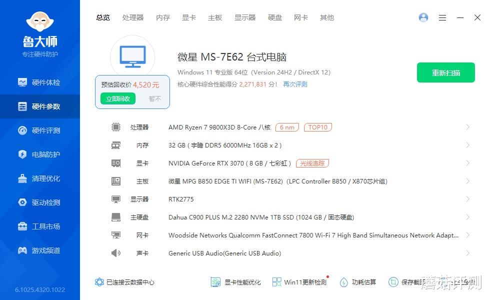 ▼简单看下整机配置,处理器是9800X3D,可以让这张RTX 3070充分发挥性能。