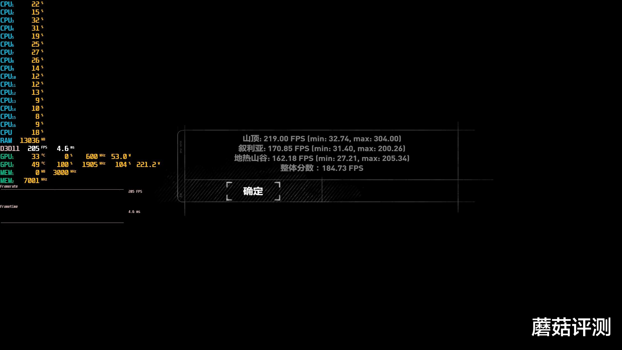 ▼最后整体的平均游戏帧数在184.73帧左右,还是非常流畅的。
