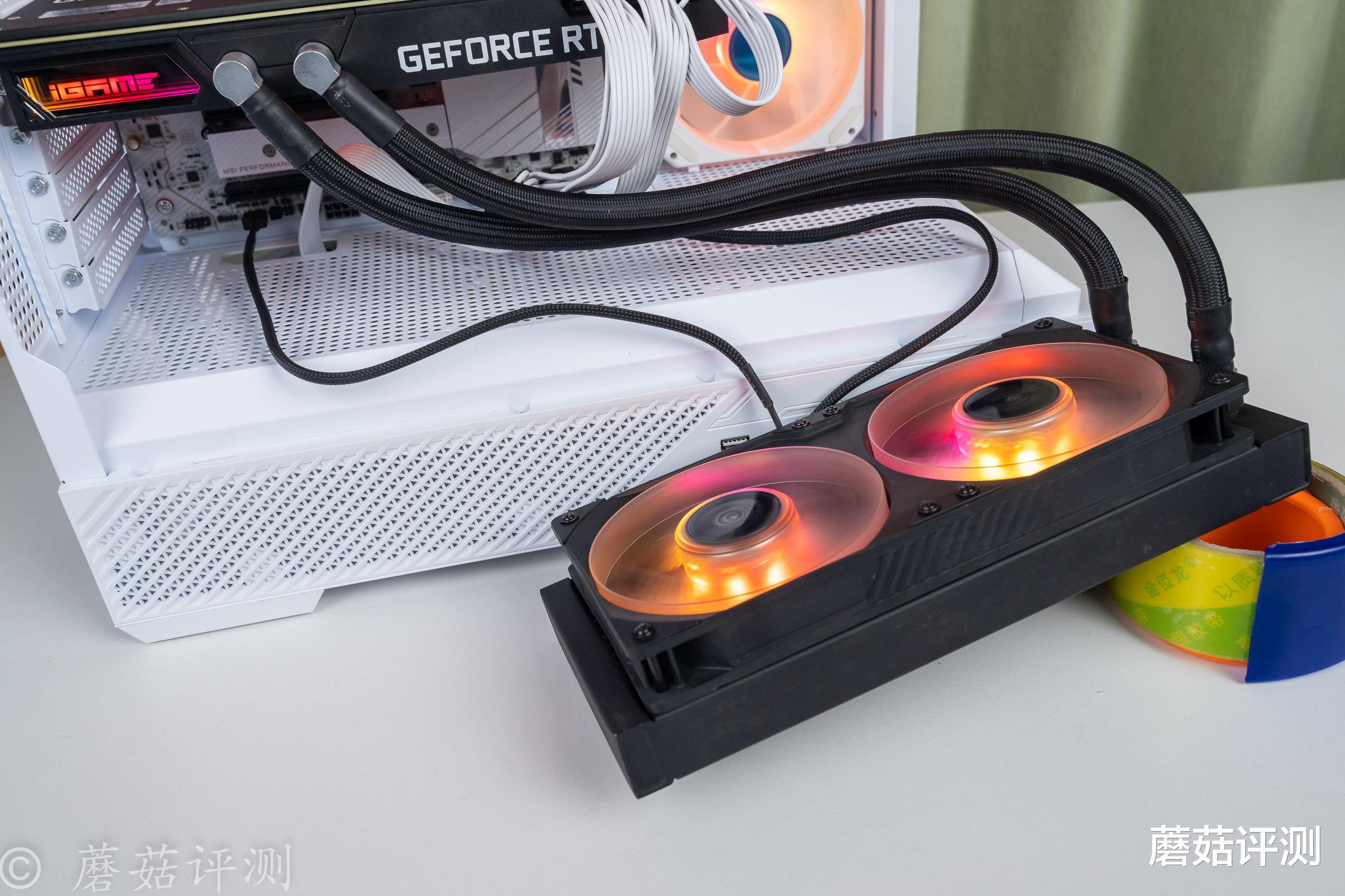 ▼冷排风扇也支持ARGB灯效,半透明的扇叶,灯效的通透感很好。