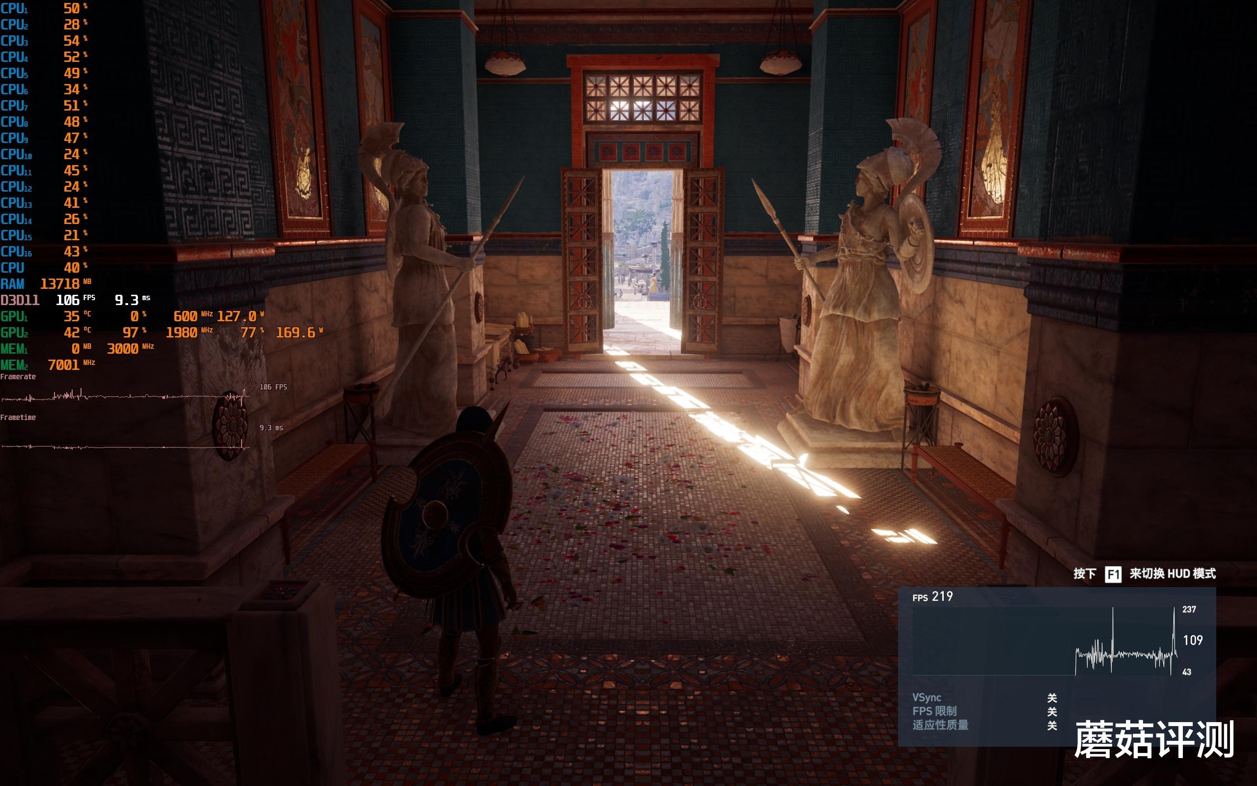 ▼众生平等奥德赛,2K分辨率,极高画质,体积云最低,走廊游戏帧数在106帧左右,显卡占用97%。