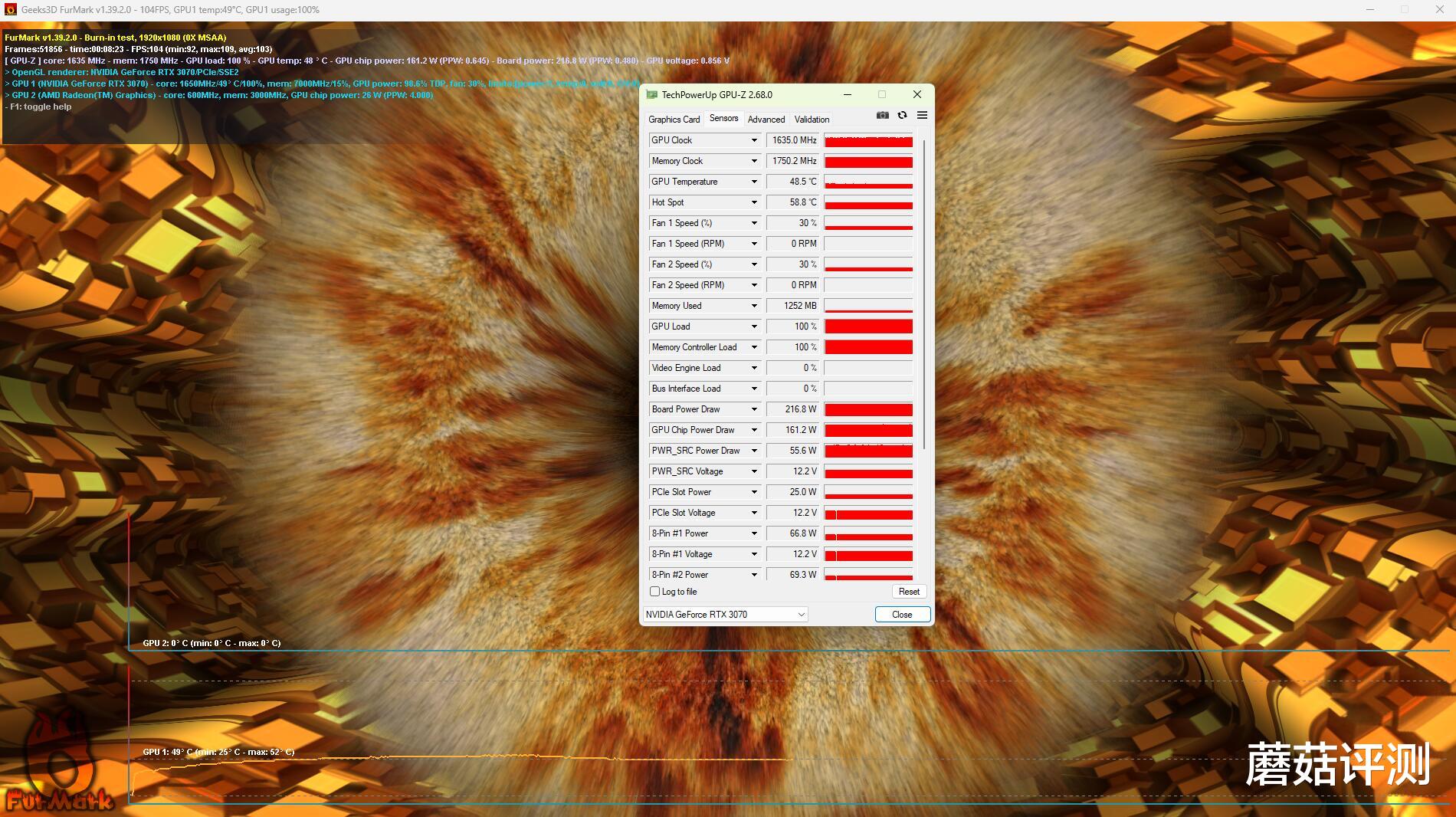 ▼把风扇转速拉到100%,显卡核心温度降到48.5℃,热点温度58.8℃,降温明显。