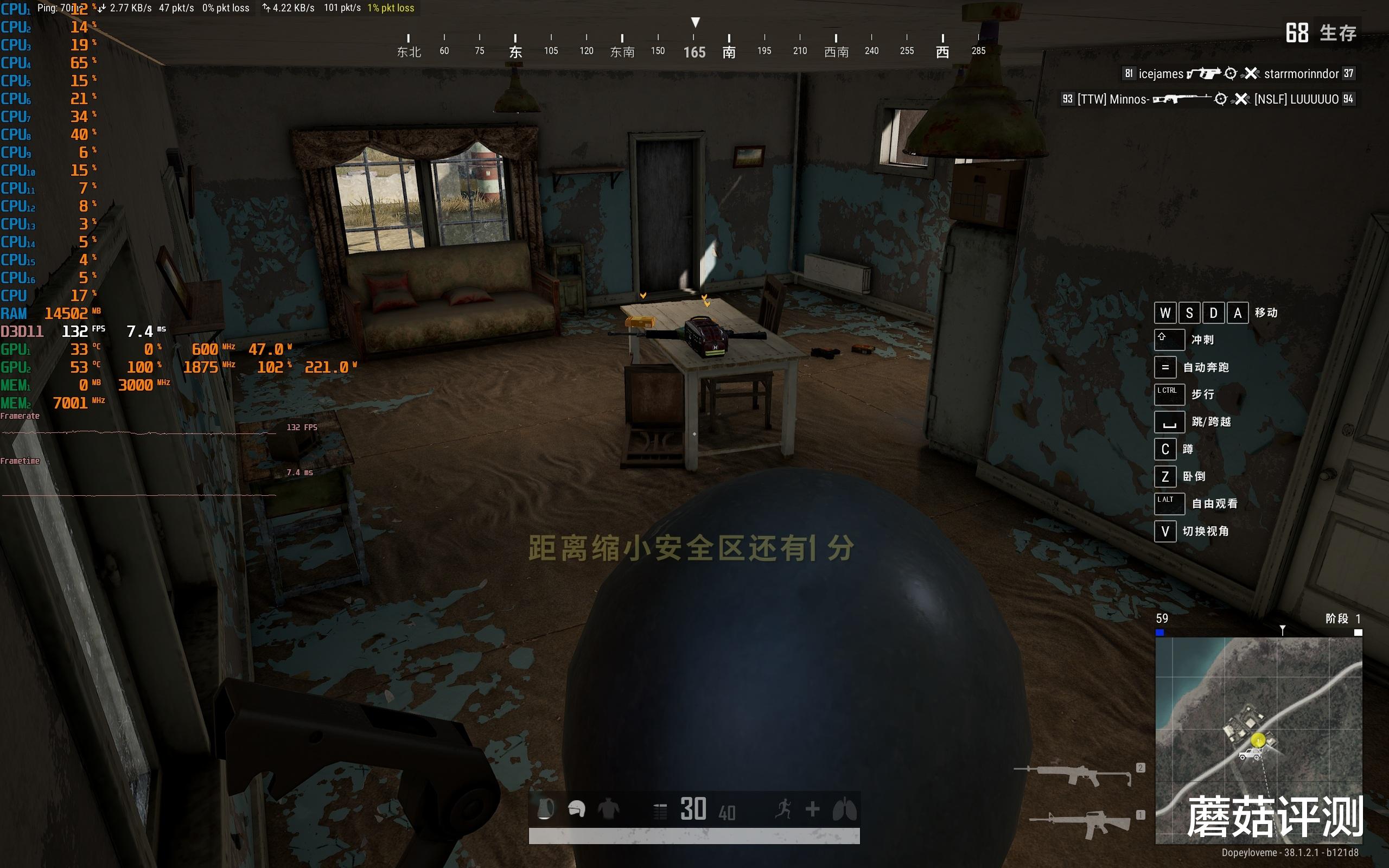 ▼室内游戏帧数在132帧左右,显卡占用100%,功耗221W,温度53℃。