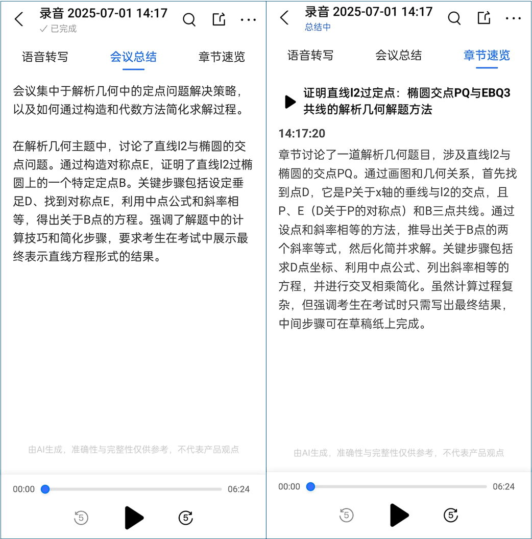 此外,「随声录」内置智能算法,当发言内容累计达 200 字时,会即刻生成逻辑清晰、重点突出的会议纪要;会议结束后,还能以 5 分钟为单位生成章节速览,帮助参会人快速定位关键细节,提升信息检索与整理效率。