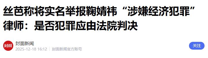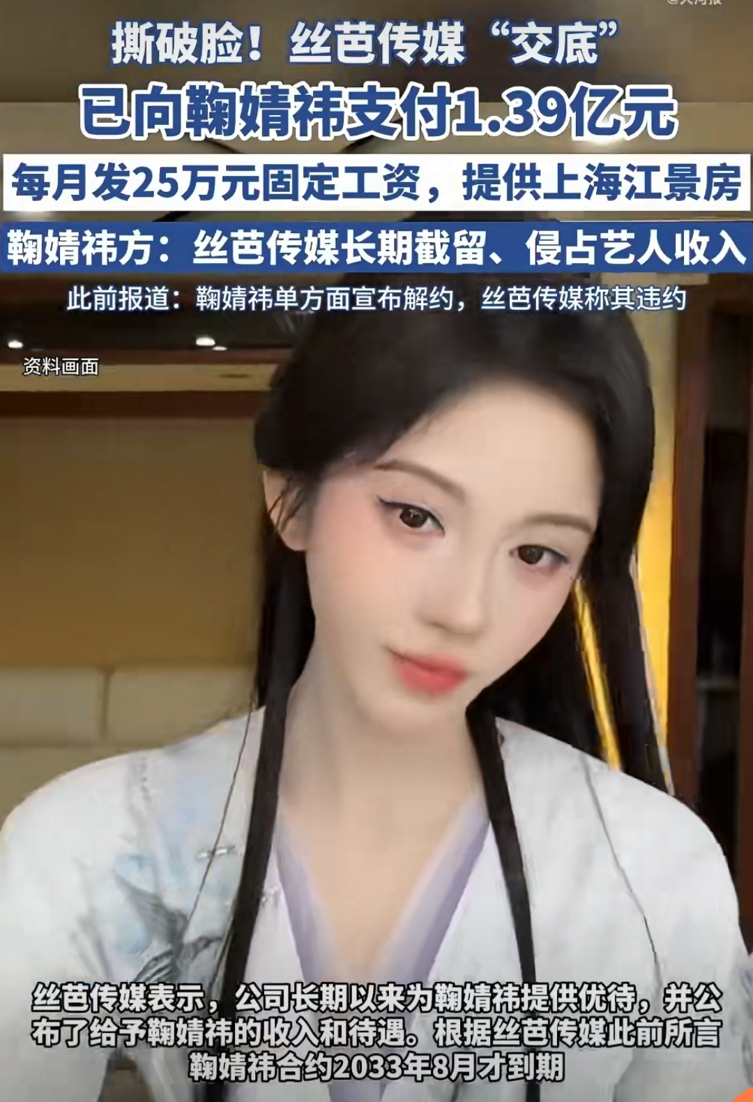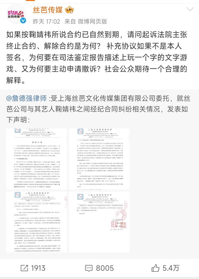 丝芭声称掌握了大量事实,随时准备实名举报。鞠婧祎方面则握着公司伪造签名、阴阳合同的指控。
